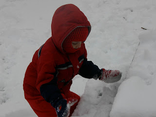 My three year old created his own winter sensory table today. He spent quite a bit of time uncovering our small picnic table while enjoying some outdoor playtime.