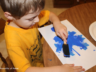 Then, he painted over the entire paper with paint and a foam brush. We pulled off the paint and the picture at the top of this post was the result.