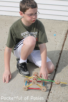 When I found an idea for a Tinker Toy catapult over at Kids Activities Blog I knew my boys would love to give it a try. I suggest you head over there first to read all of the great info about the experiment.