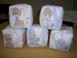 I made these cloth blocks for the baby for Christmas. I used a pre-printed Precious Moments quilt panel that had been given to me. I cut out the blocks and stitched them together. I stuffed them with fiberfill. They were pretty easy to put together.