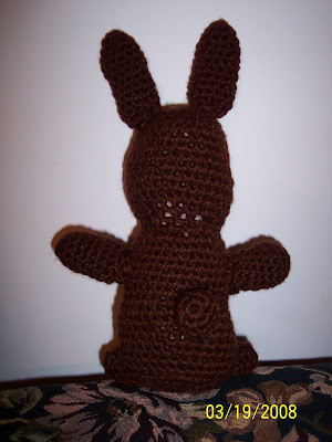 I found the pattern for this bunny here. I thought it looked cute. So, I sat down Monday evening and started it. I finished it last night. I used some acrylic yarn I have had for a long time. I used black and pink yarn for the face details. The pattern called for safety eyes, but I figured yarn was safer (and I didn’t have those type of eyes anyway). Mine didn’t turn out as cute as the one pictured on the site, but I think he has character. I made it for the baby and I am sure he won’t care that the tail is off center.