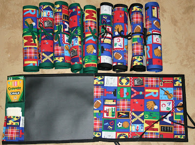 I used 1/4″ bias tape to make the ties (I stitched down the length of a whole package and then cut them into 9″ lengths.) I attached them to the short edge on the middle of the back side so they would be under the binding. I also sewed over them a few times for good measure. I made erasers out of 4″ squares of Sherpa (the Joann’s kind). I folded them in half with wrong sides together and faux serged the 3 cut sides. I tried rounding the corners of a few of the rolls, and left some straight. I also tried zig-zagging 2 of them and didn’t like that so I just used a straight stitch for the rest. The fabrics were all from my stash (except the chalk cloth). I put a piece of white chalk in each pocket and I will give a pack of colored chalk with each roll. One thing I did do was use a leather needle for sewing through the chalk cloth. My machine skipped stitches otherwise.