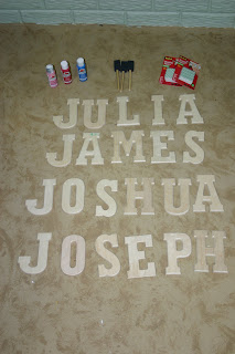 Lastly, I wanted to get the kids wooden letters of their names for their rooms. However, I didn’t like some of the prices I was seeing. I found some large unfinished letters for $0.99 each at Crafts, Etc. I ordered enough items to get free shipping, so that was a bonus. Then I gave each child their letters, some paint, a foam brush and foam mounting squares. We painted the letters a few days ago which was lots of fun. Now I just need to hang them up.