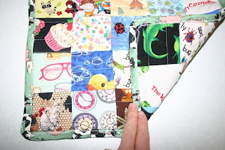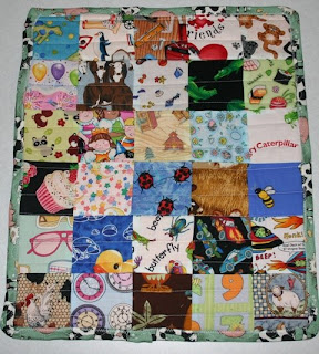First, I cut those 30 squares of fabric into fourths. I used 2 each on this quilt. It is 2 sided, but the squares are arranged differently on each side. After piecing both sides I quilted them together with some horizontal rows of stitching. It was my first attempt at actual quilting, other than stitching in the ditch. It is by no means perfect, but it was fun. I hope that it will be entertaining for my son to look at all of the interesting objects.