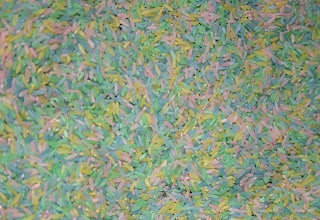 In a zip-top plastic bag (or other lidded plastic container) mix the rubbing alcohol and food coloring. Add the rice, seal the bag and shake. Once the rice is colored spread it out on waxed paper to dry.