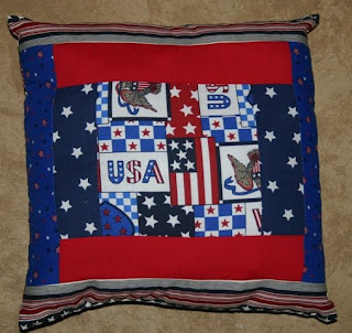 A couple of months ago my mom was given several bags of fabric from her neighbor. She let me take whatever I wanted which was fun. My older two children loved picking out fabrics. My oldest son picked out all of the American fabric he could find. So, I made him this 12″ x 12″ pillow out of the fabrics he chose. I am not sure what I will do with the rest of the fabric he picked out.