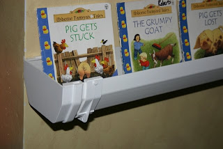 My husband installed our cool new bookshelf last week. Can you guess what it is made from? Plastic rain gutters! To make the shelf he bought a piece of guttering, 2 end caps that have rubber seals that hold them in place, and some brackets. He used some tin snips to cut the gutter to size, popped on the caps, and then screwed in the brackets to the studs in the wall. The whole project took probably 20 minutes max.