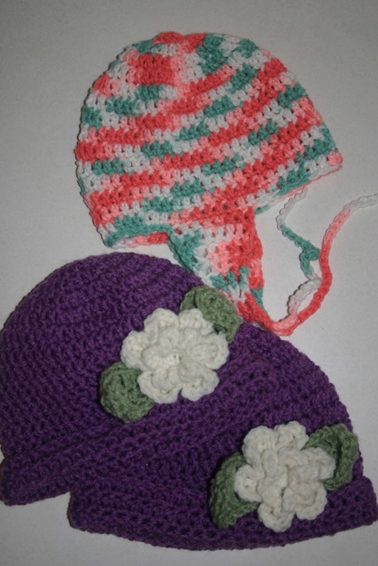 The hats pictured above are for the three little girls I babysit on Tuesdays and Thursdays. The purple hats with flowers are identical for two of the girls who are sisters. The hat with ear flaps is for the other little girl I watch. They were made with acrylic yarn from my stash, and I hope they will keep these little girls warm this winter.
