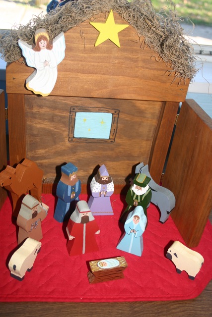 She used scrap 2×4′s and stained them. Then she cut out felt and glued it on to make this child friendly nativity set. My children have loved playing with this set during the past few years.