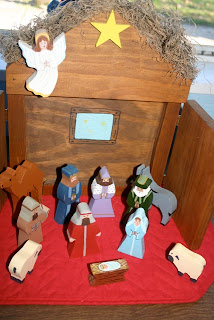 Anyway, that year my mom made the gorgeous nativity set above. Not only did she make one for us, but she made many sets. (How many, Mom?) She cut the wood herself and painted and stained everything. I can’t even begin to imagine all of the hours she spent. I was so busy with wedding preparations, college, and working that I don’t even remember her working on them. If I didn’t appreciate all of the time and love she put into making this set back then, I sure do now. (Thanks, Mom!)