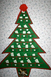 The advent calendar was made from a piece of poster board cut into the shape of a Christmas tree and then covered with felt that had 25 numbered pockets sewn on it. It was trimmed in ric rac, a pom pom and a metallic flower.