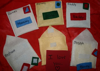 I used the tutorial from Lu Bird Baby for the letters, but didn't totally do it the same. I decided to use craft foam to make letters. I like that the stamps and "address labels" can be interchanged.