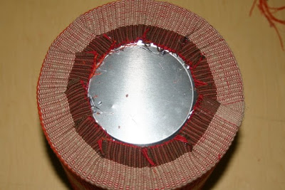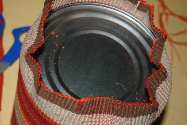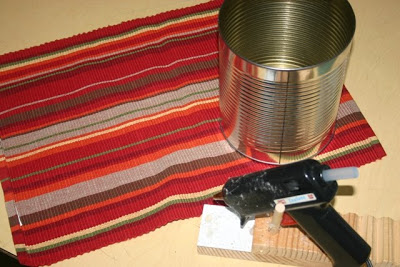Then, I tucked the 5 1/2 inches of placemat inside the can opening and hot glued it in place.