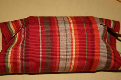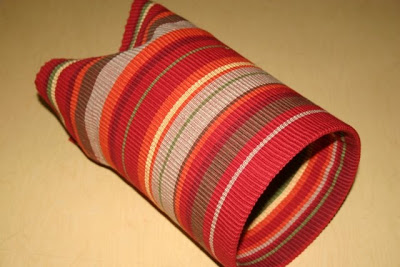 The first thing I did was to lay the can on the placemat. I ended up with about 5 1/2 inches of placemat at the top of the can and about 1 1/2 inches at the bottom. I hot glued the placemat in place around the top and botton and where the two ends met at the center of the can. (Notice how I was able to match the stripes up.)