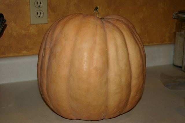 My brother and sister-in-law grew this pumpkin this year and gave it to me. Their method of growing was a little unorthodox. They basically threw out the seeds from pumpkins they cut up last year behind their garage and several grew this year.