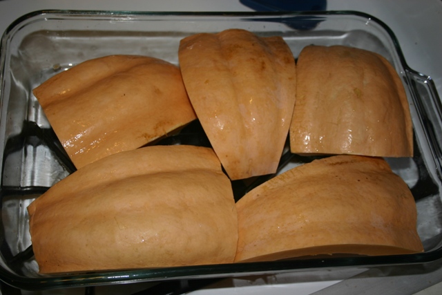 I covered the pan with foil and put it into a 350 degree oven. My pumpkin pieces took 1 1/2 hours to bake. You will know it is done when the shell can easily be squished down when you press on it. Pretty scientific, huh?