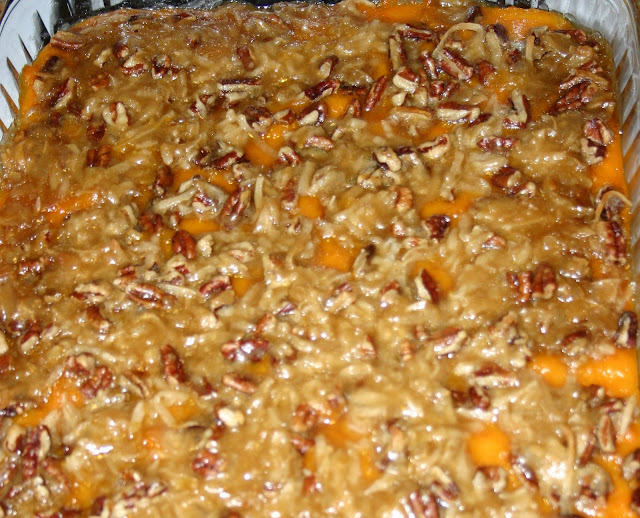 Mix the first 5 ingredients. Pour into bottom of a greased 9”x13” casserole dish. Mix topping ingredients. Crumble over top of sweet potato mixture. Bake at 350 degrees for 20 to 25 minutes.