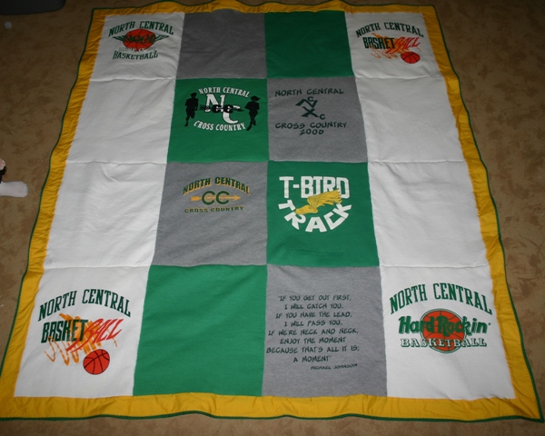 When my sister-in-law saw the T-shirt quilt I made for my husband she asked if I would be interested in making one for my brother. I didn’t have anything figured out for him for Christmas, so I said I could do it. Instead of T-shirts my sister-in-law brought me 8 sweatshirts. I had to use the fronts and the backs and made each block 15 inches by 18 inches instead of the 12 1/2 inch squares I made for my husband’s quilt.