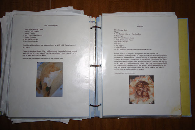 What I had attempted to do was take a picture of each recipe I make and type up the directions. Then I put the printed recipe into a plastic sheet protector. I like this idea, but then I kind of quit doing that.