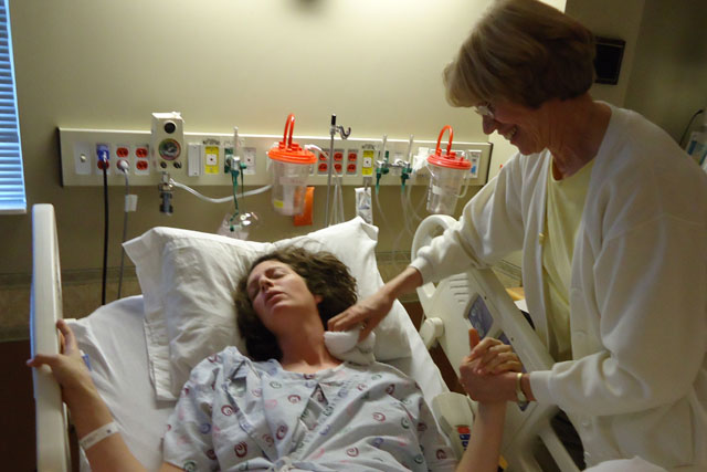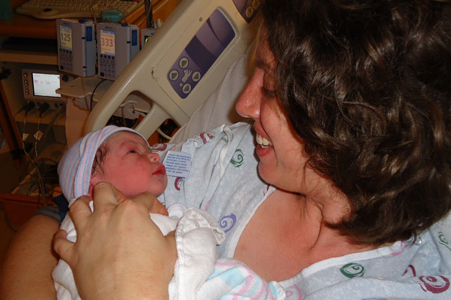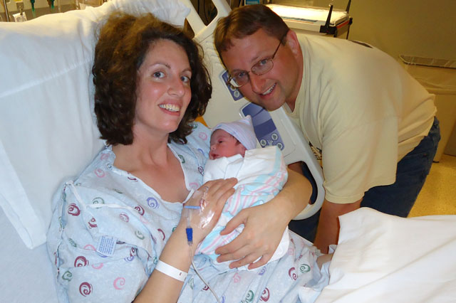 My husband took my dad and Joseph to my parents’ house and came to the hospital sometime after 8:00 a.m. I had thought I would be alright if he couldn’t come to the birth, but I really did want him there. My mom is a wonderful support during labor, but the relief I felt when my husband walked through that door almost made me cry.