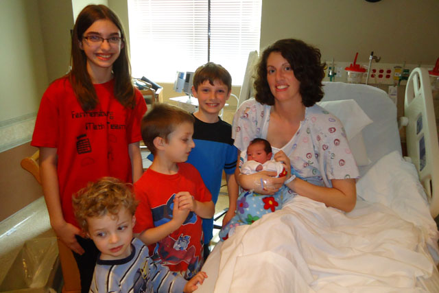 My husband then left to get Joseph and my dad. Joseph wasn’t too sure about the baby, but was relieved to see me. A few hours later my husband picked up my older three children from school and brought them to the hospital. It was wonderful to have all five of my children with me. Anyone that wonders how a mother can love five children has obviously never had five children. Each of my children is unique and special and totally deserving of my love.