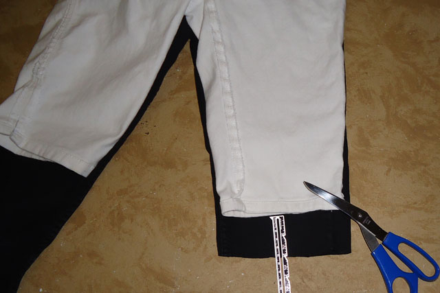 First, I used a pair of shorts that fit my daughter and laid them on top of the pairs of pants. I added two inches to the length because my daughter wanted them to be a little longer. Then I cut off the excess.