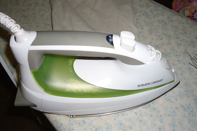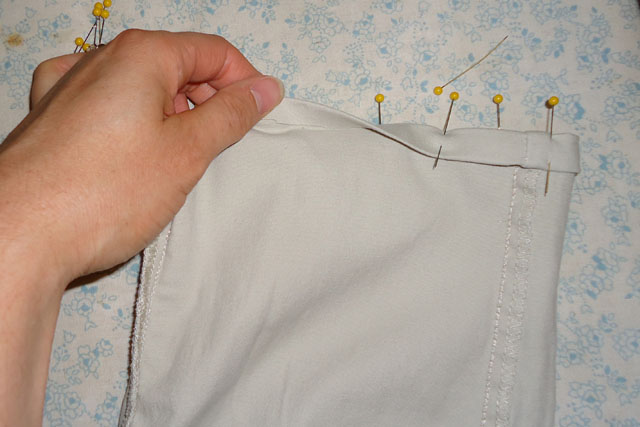 I then pressed the hem. Next, I folded the hem under again so that the raw edge was tucked under and touched the original 1 inch pressing line. Then I pressed the hem again.