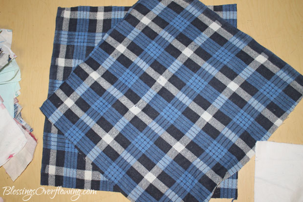 To make flannel wipes you will need two squares of flannel that are the same size. I used my 12 1/2 inch square ruler to cut these pieces of flannel. I like to make baby wipes 6 1/2 inches square. The tiny wipes I made were about 3 inches square.