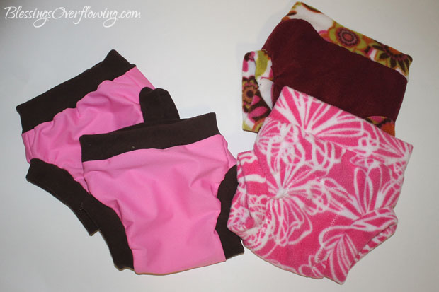 The covers pictured on the right are made from fleece I had in my stash and the two on the left are made from 1 mm PUL that I purchased along with a fleece waistband and leg cuffs.