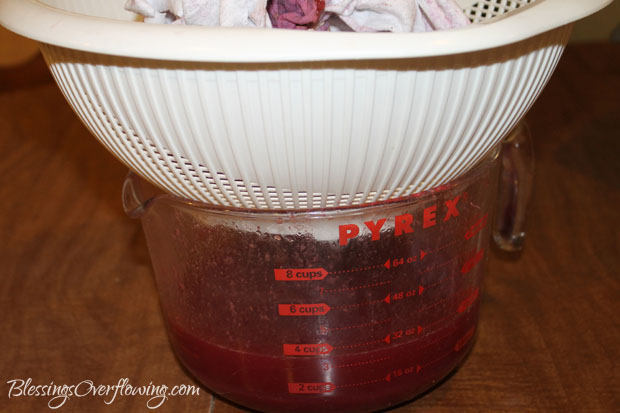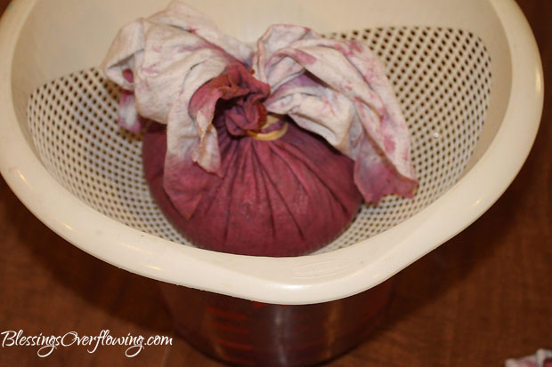 You are supposed to let the grapes strain overnight and not squeeze the bag. Confession: I did not let the grapes strain overnight and I did squeeze the bag. I think the jelly turned out fine in spite of my impatience.