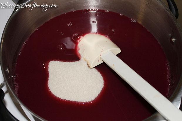 I poured the juice into a pan and added 3 cups of sugar (I used evaporated cane juice.). I stirred it well and then turned the heat to high.