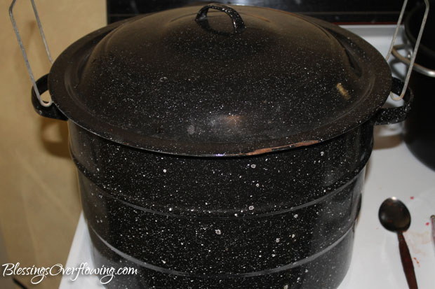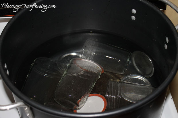 While I was boiling the juice and sugar mixture, I was also heating a large pan with jelly jars and lids. I didn’t boil the water but simmered it.