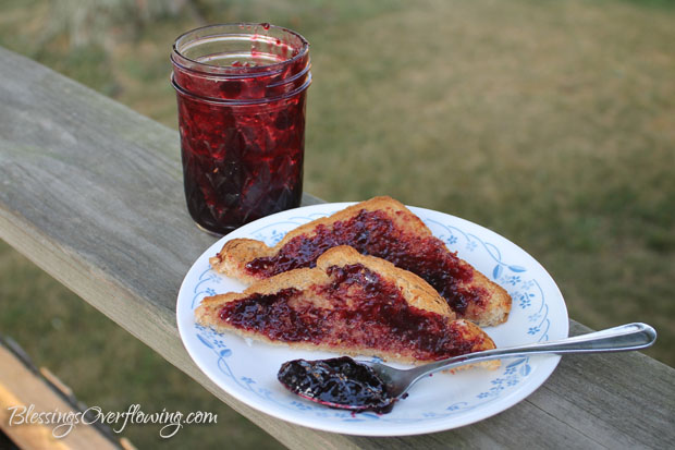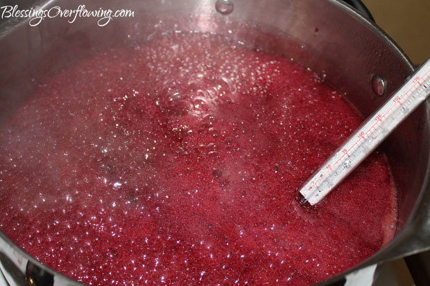 I have made blackberry jelly lots of times so I figured it would be a similar process. I usually use Sure Jell with good results. I thought I had some with my canning supplies, but I was wrong. I didn’t want to drag 5 kids to the store just to get one thing so I improvised and made it the old fashioned way, without any pectin.