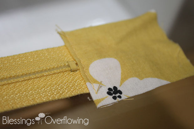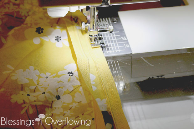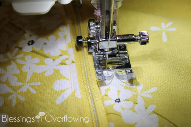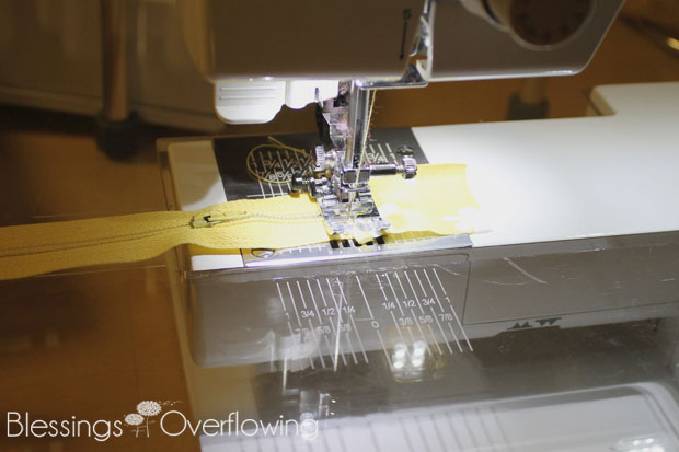 5. Using a zipper foot sew along the zipper with the zipper foot right beside the teeth. Backstitch at both ends.