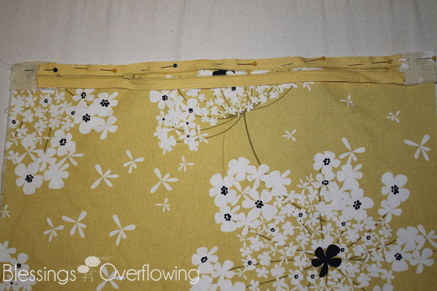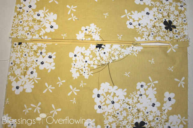 7. Fold the fabric so that right sides are together and the zipper is at the top. Pin the fabric in place.