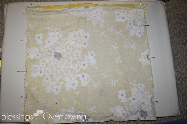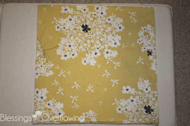 For example, the large pillows (yellow floral) I made I used a 16 inch pillow form and cut my fabric to a size of 17 1/4 inches square. For my 14 inch pillows forms (stripes) I cut my fabric to a size of 15 1/4 inches square. Finally, for the small pillows I didn’t use a pillow from or a zipper. I simply cut the fabric at 9 1/4 inches square and stuffed them.