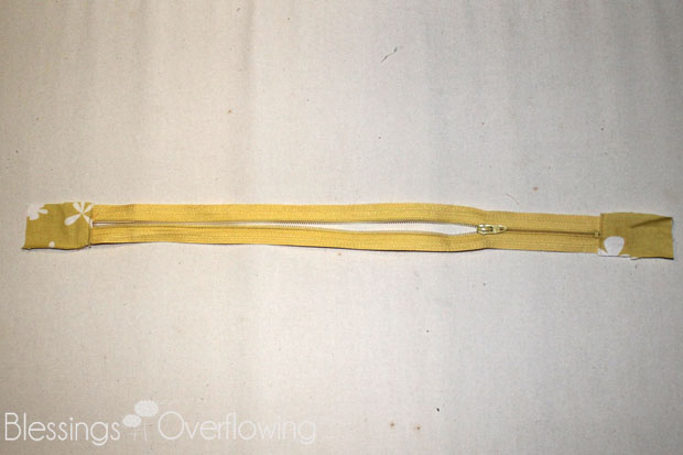 This is what your zipper should look like after sewing the small fabric pieces to each end of the zipper.