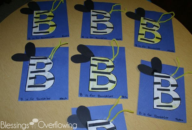 We made these cute bumblebees using an idea I found on No Time For Flashcards. The children colored the “B” with yellow crayons, and then I cut them out. We glued them to a blue piece of construction paper and added the wings, stripes, and antennae I already had cut out. This was a fun project for the children.
