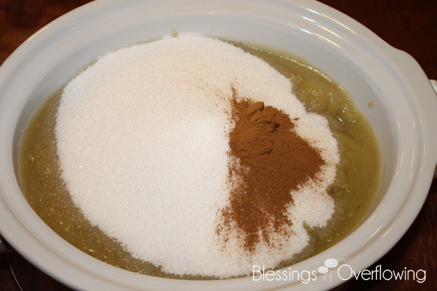 - Combine the applesauce, sugar, cinnamon, and ground cloves together in a crockpot.