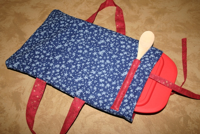 Here is the finished casserole carrier complete with a spoon pocket just big enough for a 10 inch wooden spoon.