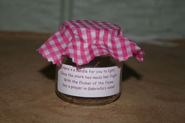 The party favors were made from empty baby food jars that a friend gave me. I cut fabric circles and hot glued them to the lid. Then I made labels for the outside. Inside I put a tea light candle that smelled like baby powder.