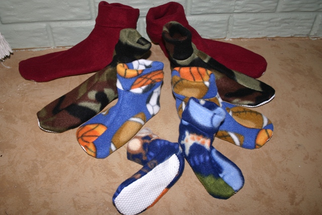 I also made slippers for the kids using this free pattern for polar fleece socks. I followed the instructions as written. To figure out which size to make for each child I used the pattern pieces for the slipper that was just a little bigger than their foot. The nice part about these slippers is the Jiffy Grip on the bottom to make them not be slippery.