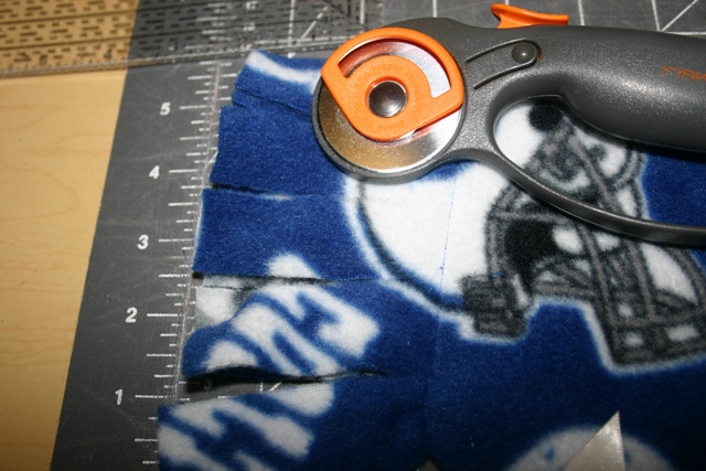 Finally, you need to cut the fringe. Using scissors or a rotary cutter cut the fleece below your 3 inch stitching line in 1 inch increments. Be careful not to cut your stitching line.