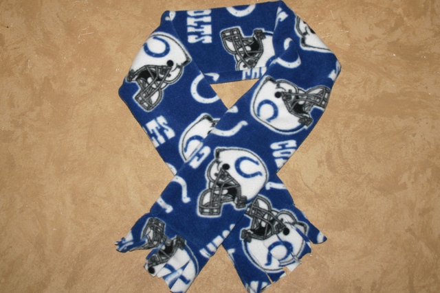 Today I stitched up 4 fleece scarves and thought I would share how I made them with you. There are three like the one pictured above for my boys. Obviously, we are Colts fans here. I have had this fleece in my stash for well over a year because I wasn’t sure who would get something made out of it. Now, all of the men in our house will have something made from it.