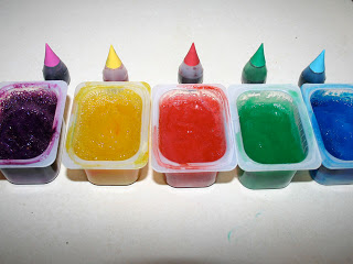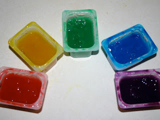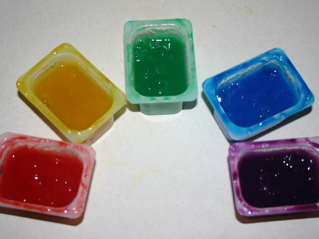 5. Divide the mixture into small containers. Stir in food coloring. I added 8 drops of liquid food coloring to each container. The colors were vibrant, but did stain our hands. I might try 5 drops next time and see what happens. Put a lid on each container when not in use. I used some empty plastic baby food containers that I had been given.