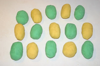 I made 2 batches and shaped them into eggs to go inside of some plastic eggs for my son’s school Easter party this week. I wrapped the play dough in plastic wrap, and it fit perfectly inside of the plastic eggs. Yay, for fun that doesn’t rot your teeth. 🙂