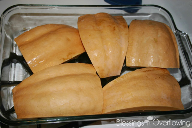 I covered the pan with foil and put it into a 350 degree oven. My pumpkin pieces took 1 1/2 hours to bake. You will know it is done when the shell can easily be squished down when you press on it. Pretty scientific, huh?