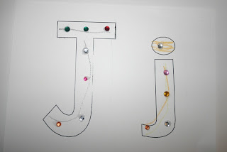 First, the children traced their letter “Jj” papers and then glued on some jewels. They loved how sparkly they were, and picking them up and placing them on dots of glue was good for their fine motor skills. The paper was from DLTK-Kids, but I modified it to have a top on the “J”. These papers will go in their alphabet binders.