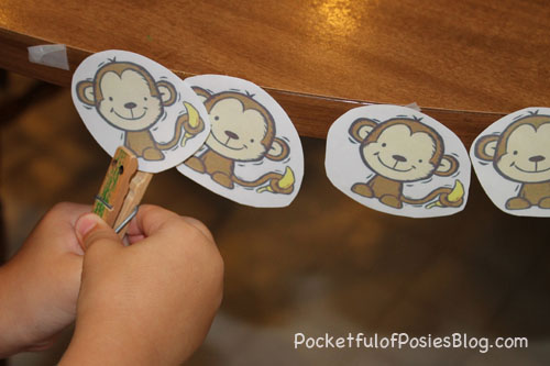 I printed, laminated and cut out 5 monkeys that I printed from Preschool Alphabet. Then I recited the poem below to my son as he used an alligator (A clothespin he colored green.) to snap the monkeys out of the tree one by one.
