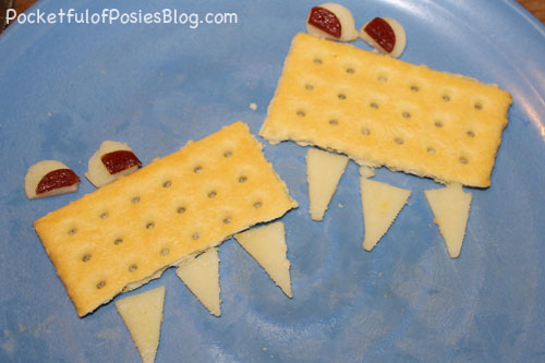 For a snack this morning I gave my son some crackers, triangle pieces of cheese, circles of cheese, and some small pieces of fruit leather so that he could make alligators. If he liked celery then that might have been a cute alternative since it would have been the right color.